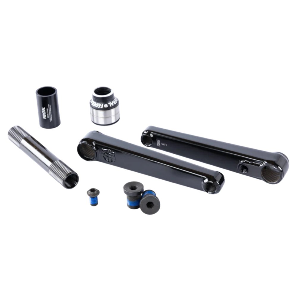 The Federal Vice crank features a unique radius box section combined with a 24mm hollow 48 splined spindle to make these some of the strongest and stiffest bmx cranks on the market. The spindle and arms are both made from heat treated 4130 Chromoly and the spindle has been internally machined to reduce weight. The cranks are designed to take all the abuse of the modern street rider and the angular shape of the arms helps to make crank slides more stable. The braised logo gives the cranks a unique and distinct appearance.The crank are Left/Right compatible and the spindle bolts can be used with either 6mm or 8mm allen keys.